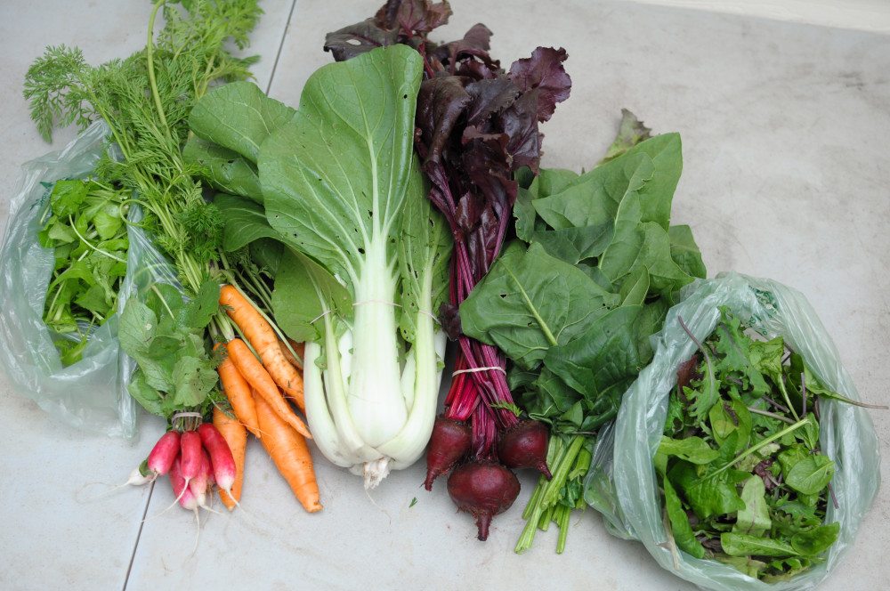 We grow an assortment of produce focused on salad mixes (and things that would go in a salad), microgreens, garlic, potatoes, tomatoes, peppers, winter squash, and shiitake mushrooms. All our produce is grown holistically, using no pesticides (organic or not) or fertilizers.